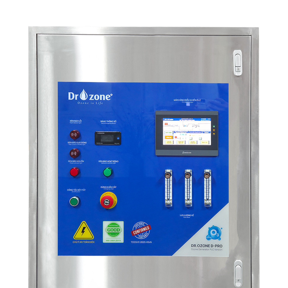 Dr.Ozone D-150 Pro sở hữu bảng điều khiển PLC hiện đại, tích hợp màn hình LCD hiển thị rõ ràng các thông số vận hành và nút bấm bố trí khoa học. Giao diện thân thiện giúp người dùng dễ dàng điều chỉnh công suất, cài đặt chế độ hoạt động và giám sát tình trạng máy. Hệ thống đèn báo thông minh cung cấp cảnh báo kịp thời về các sự cố như quá dòng, thiếu nước làm mát hay lưu lượng khí ozone thấp, đảm bảo an toàn và hiệu quả vận hành tối ưu.